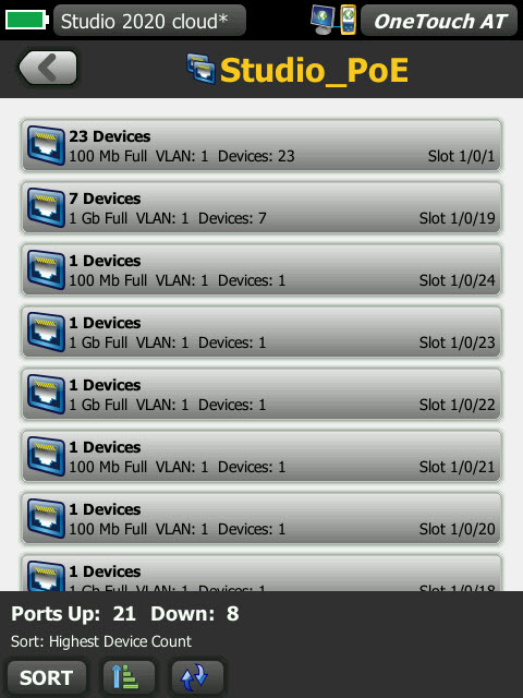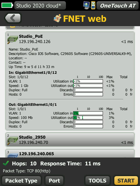 6、自动发现铜线和光纤连接设备以及关键设备属性。从十四种不同排序中选择,获取有线网络的不同视图。例如,根据 IPv4 或 IPv6 地址进行排序可识别已使用的和可用的地址。或者根据交换机名称/槽口/端口进行排序,可以了解网络设备的连接位置。根据已发现的问题进行排序可以快速识别潜在的问题。其他发现辅助型分析工具有助于故障诊断和配置文件创建。例如,多端口信息统计工具可查看交换机、路由器和 AP 端口统计信息,包括速度、duplex、槽口、端口、VLAN、主机数、利用率、丢弃和错误。端口工具上的设备可提供单独交换机端口连接的设备的详细信息。路径分析工具提供了从 OneTouch AT 至目标设备的第 2 和 3 层跟踪路由,包括每次跳转时间以及 SNMP 交换机和路由器端口统计信息。