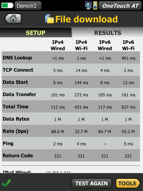 测试结果同时显示,以轻松进行有线/Wi-Fi 和 IPv4/IPv6 性能对比。以下为几个示例:ping(拼接)您的 WLAN 控制器,连接至 VoIP 呼叫管理器上的端口 2000,下载具有 Web 界面的应用程序页面,从服务器上传或下载文件,订阅多播组,访问点播流媒体视频服务器中的视频内容,或者向您的手机发送文本消息电子邮件。