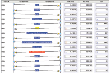CSA 应用程序弹跳图视图使用应用程序指令语言揭示客户端和服务器进行的会话,而不必手动解码信息包。它提供一种了解各种网络元件之间协议互动的极为强效的方法。