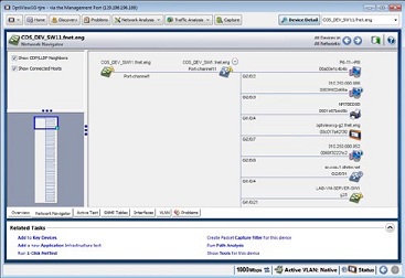 Trace SwitchRoute 可以让您了解两台设备通过交换机和路由器架构进行通信时使用的确切路径。在路径分析期间,第 2 和 3 层跟踪路由的组合可以识别出应用程序客户端和应用程序服务器之间的整个网络路径,加速问题隔离。在发现期间,如果在路径中发现某个交换机,Trace SwitchRoute 将启动其交换机路径发现功能。所显示的结果包括 DNS 名称和 IP 地址、按端口号的内部交换机连接,以及链接速度和 VLAN 信息。在 Trace SwitchRoute 屏幕的“Name”(名称)列中突出显示任何一种设备,并选择“Device Detail”(设备详细信息),可以查看设备的网络配置信息。
