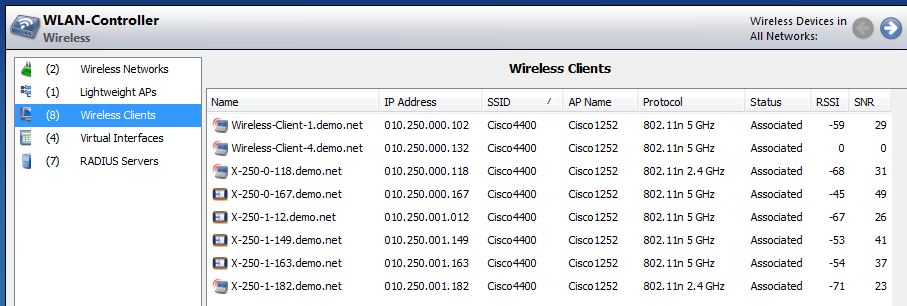 OptiView XG 可以通过其有线侧网络发现和分析功能发现并分类无线 LAN 控制器、轻型接入点 (AP)、智能接入点以及无线客户端。Cisco、Aruba 和 Meru Wireless LAN 控制器 (WLC) 以及 LWAP 提供详细的设备信息,包括与控制器、SSID、安全性和 QoS 参量、受控的轻型接入点,和使用的 802.11 协议相关的无线网络。
