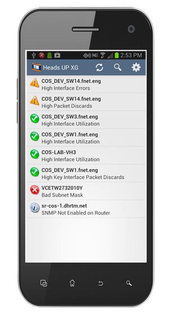 OptiView? XG 可自动扫描网络基础架构中的错误。这些错误收集在可进行分类和排序的问题日志中。可检测到的问题包括:性能问题、重复 IP 地址、错误子网掩码、默认路由器无响应等等。可以通过安卓(可通过 Google Play 获得)和苹果 iOSv6(可通过 Apple iStore 免费获得)的全新应用程序 HeadsUp? XG,接收来自 OptiView XG 平板的实时通知。即时通知意味着您可以一直与自己的网络保持“联系”,甚至在用户开始打电话联系客服前就已经发现主要问题!