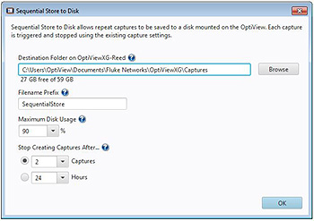 顺序保存到磁盘可在 OptiView XG 分析仪的内部磁盘上保存多个顺序捕获,或捕获多个触发事件,捕获量超过 4 GB 数据 – 有助于解决最棘手的问题。用户可设置目标驱动器和文件夹、文件名称前缀(XG 为后缀分配时间戳),并为最大捕获数量设置规则或磁盘使用设置限制。