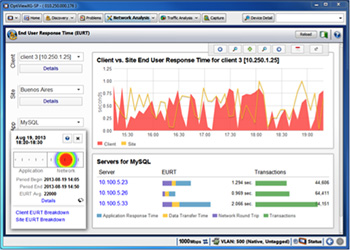 通过与 Visual TruView (v9) 的集成,XG 用户(版本 12)能够按用户、站点、服务器和应用全面了解最终用户响应时间 (EURT) 指标。借助对根本原因的详细分析,图形式“热图”能够迅速指出应用性能的问题是在网络还是在应用程序。