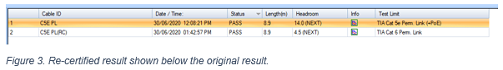 重新認證后,新的測試結果將顯示在結果列表中,重新認證的結果用相同的電纜ID標識,但附加(RC)。