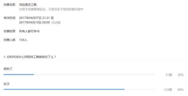 還記得不久前發布的《WiFi爛?99%的無線辦公網項目都漏了這一步》么?我們明確提到目前大多數無線辦公網項目的現場工勘都做得不到位。而觀眾投票結果也印證了這一點,在154位投票者中,只有20%認為自己管理的無線辦公網的規劃工勘環節做到位了,有點令人傷心。