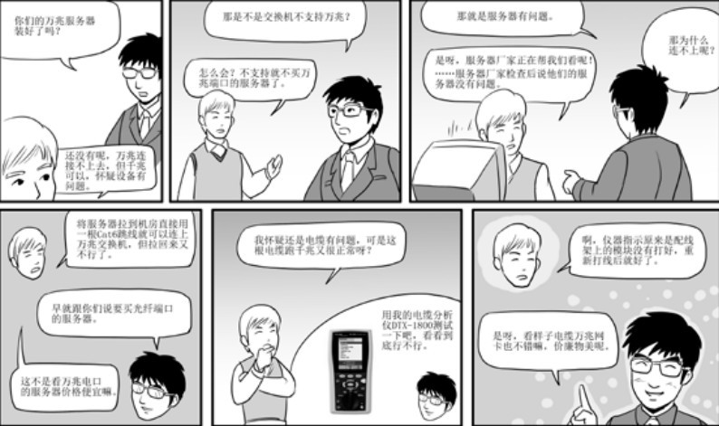 六類線在距離不長的時候可以支持萬兆上網,如果距離太長或者電纜捆綁的數量太大, 則可能造成參數劣化不足以支持萬兆。本例主要是鏈路中的配線架模塊沒有打好,造成近端串擾太大,導致鏈路的誤碼率太高,不能自適應成萬兆狀態(自適應成千兆沒有問題)。福祿克FLUKE電纜分析儀DTX-1800可以測試6/6A/7類鏈路的質量,并且精確地提示哪個地方存在串擾超差的問題或者存在阻抗突變的問題,非常精確、快捷方便,對高速鏈路的用戶比如數據中心和大中型智能建筑的維護非常有幫助。??